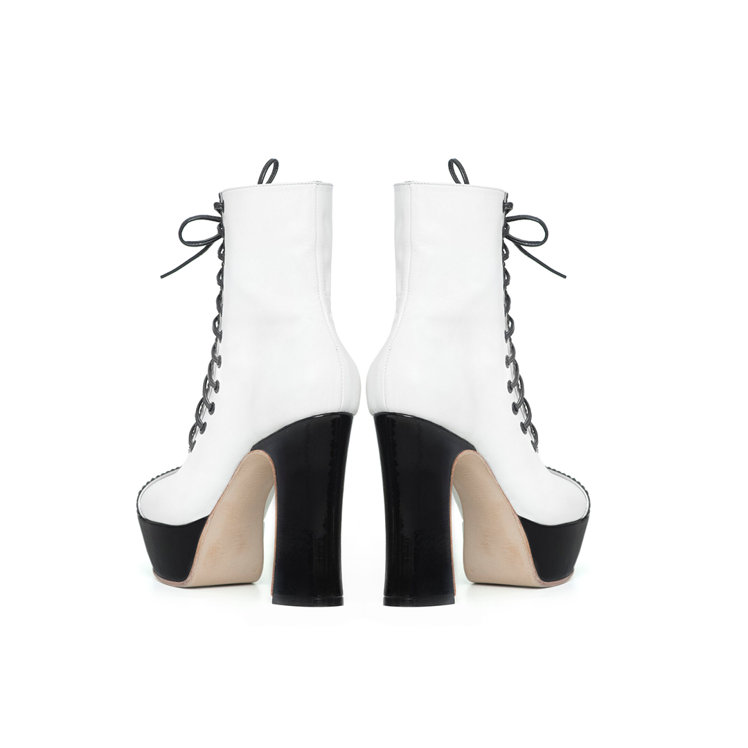 Esta bota celebra la clásica combinación de blanco y negro, evocando una elegancia atemporal en un diseño moderno.