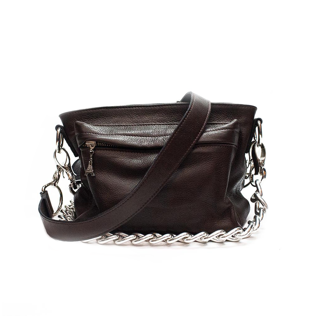 Cartera bandolera en cuero vacuno | Bolsillo exterior, bolsillo plaqué, porta celular y mosquetón para llaves | Correa ajustable (de 71 a 133 cm.) | Opción de correa cadena de 50 cm. | Medidas: 27,5 x 20 cm.