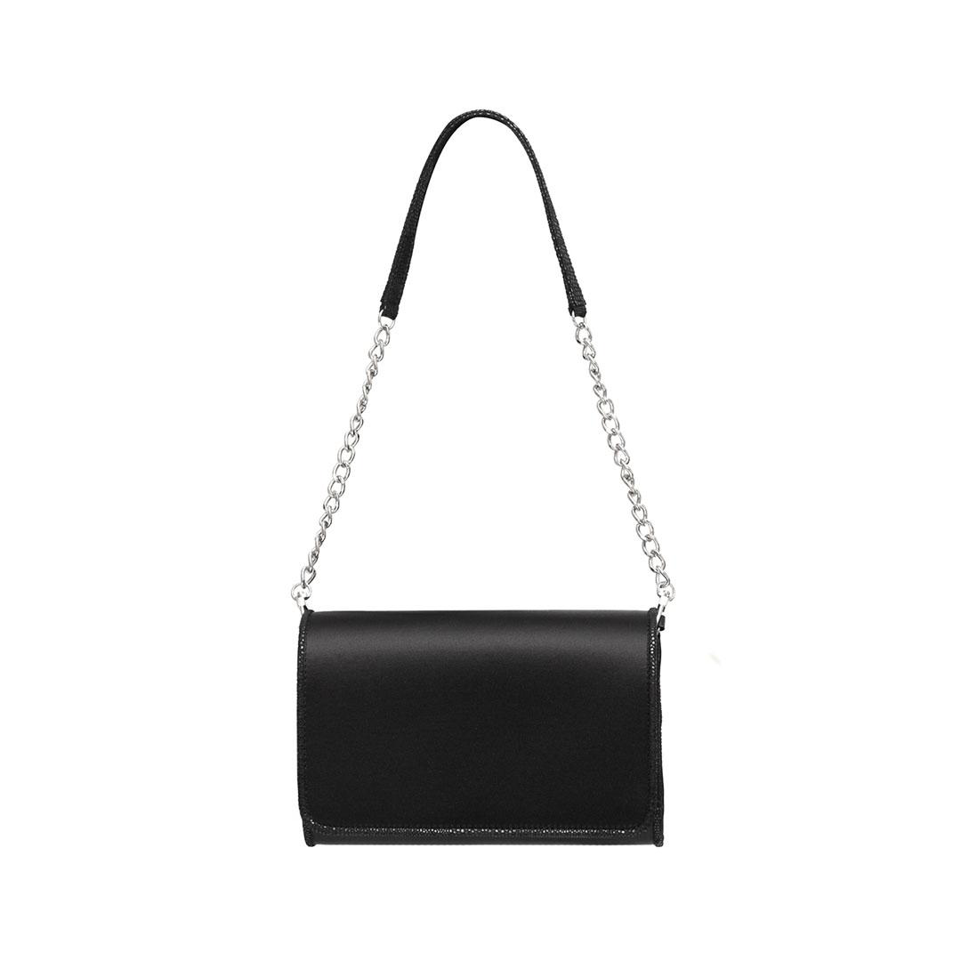 Sobre de mano de raso | Bolsillo con cierre y bolsillo plaqué | Correa mitad cuero mitad cadena de 68 cm. en total | Herrajes plata | Medidas: 20,5 cm. x 13,5 cm., fuelle de 6 cm.