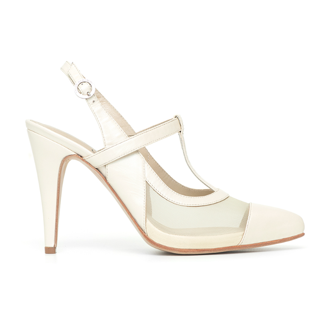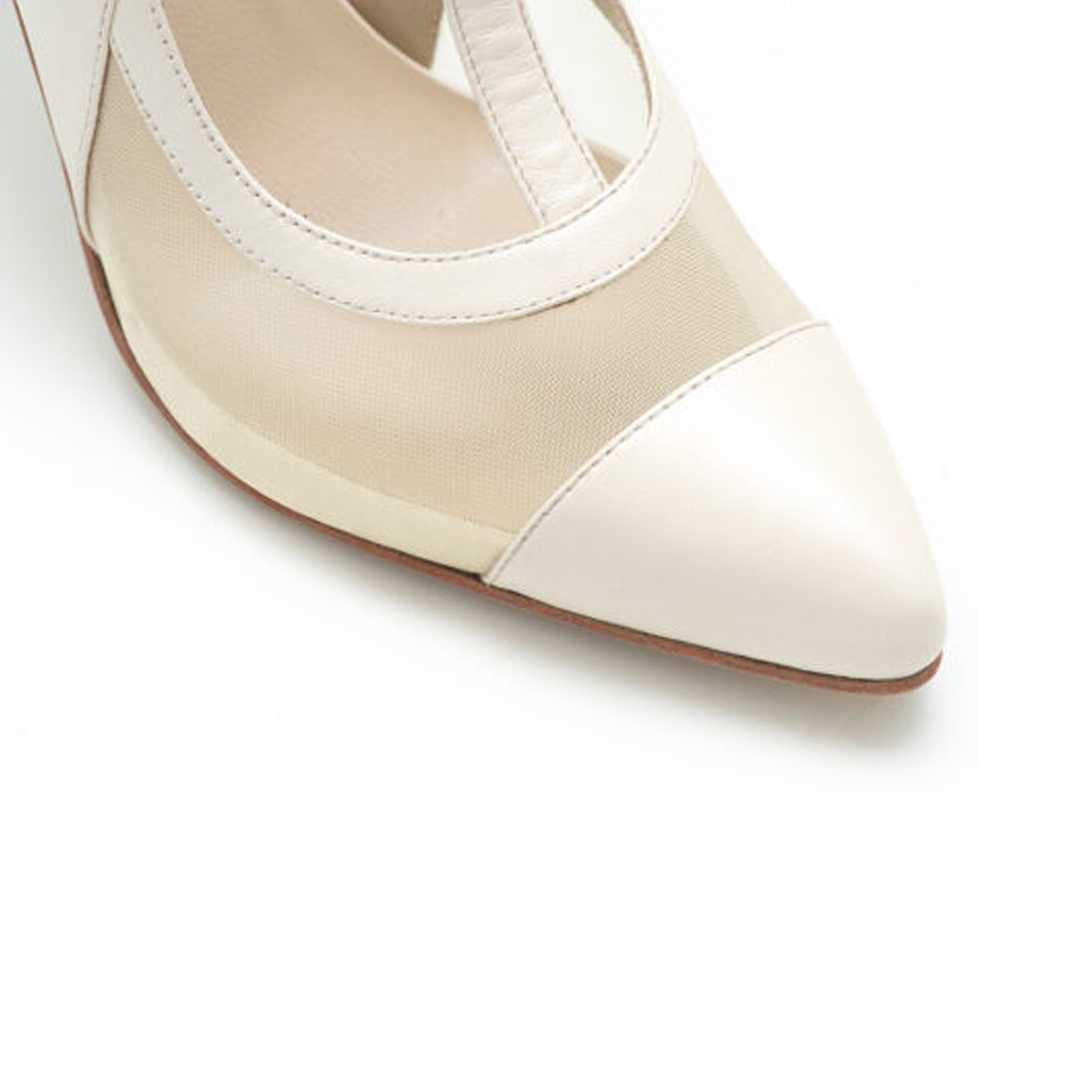 Este stiletto de cabritilla en tono marfil presenta un diseño exclusivo que combina elegancia clásica con detalles modernos. La delicada red al tono añade textura y profundidad, creando un contraste sutil que realza la sofisticación del calzado.