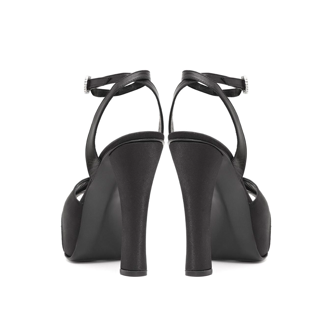 • Capellada cruzada en raso y cabritilla negra: Una fusión elegante de texturas que aporta sofisticación al diseño.