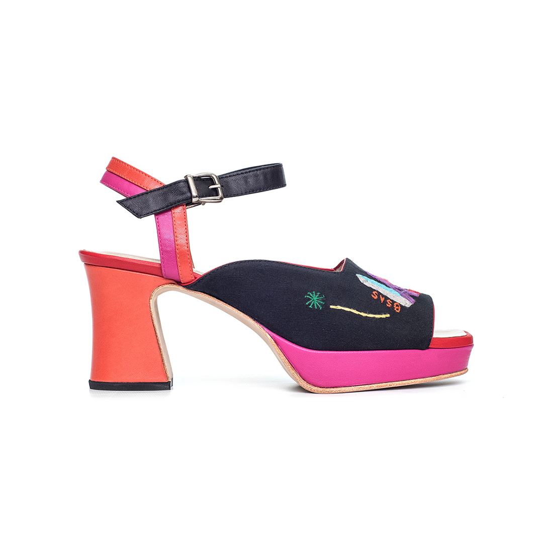 La Sandalia Lila París – Buenos Aires celebra el encuentro entre dos mundos a través del color y el trabajo artesanal. Confeccionada en cabritilla roja fucsia y naranja, y una capellada bordada a mano en tela, esta pieza fusiona energía latina con refinamiento europeo en un diseño expresivo y único.
