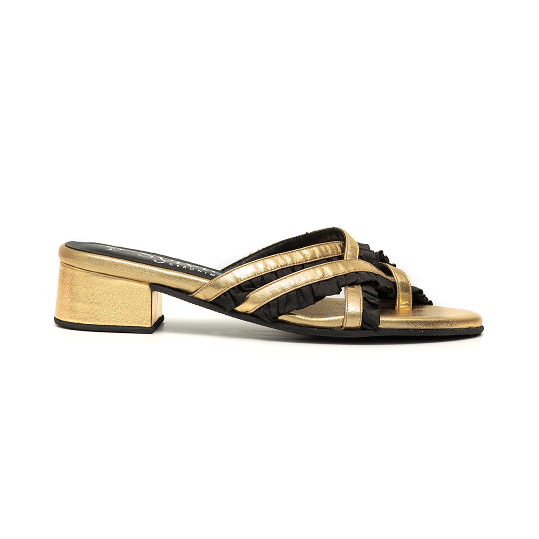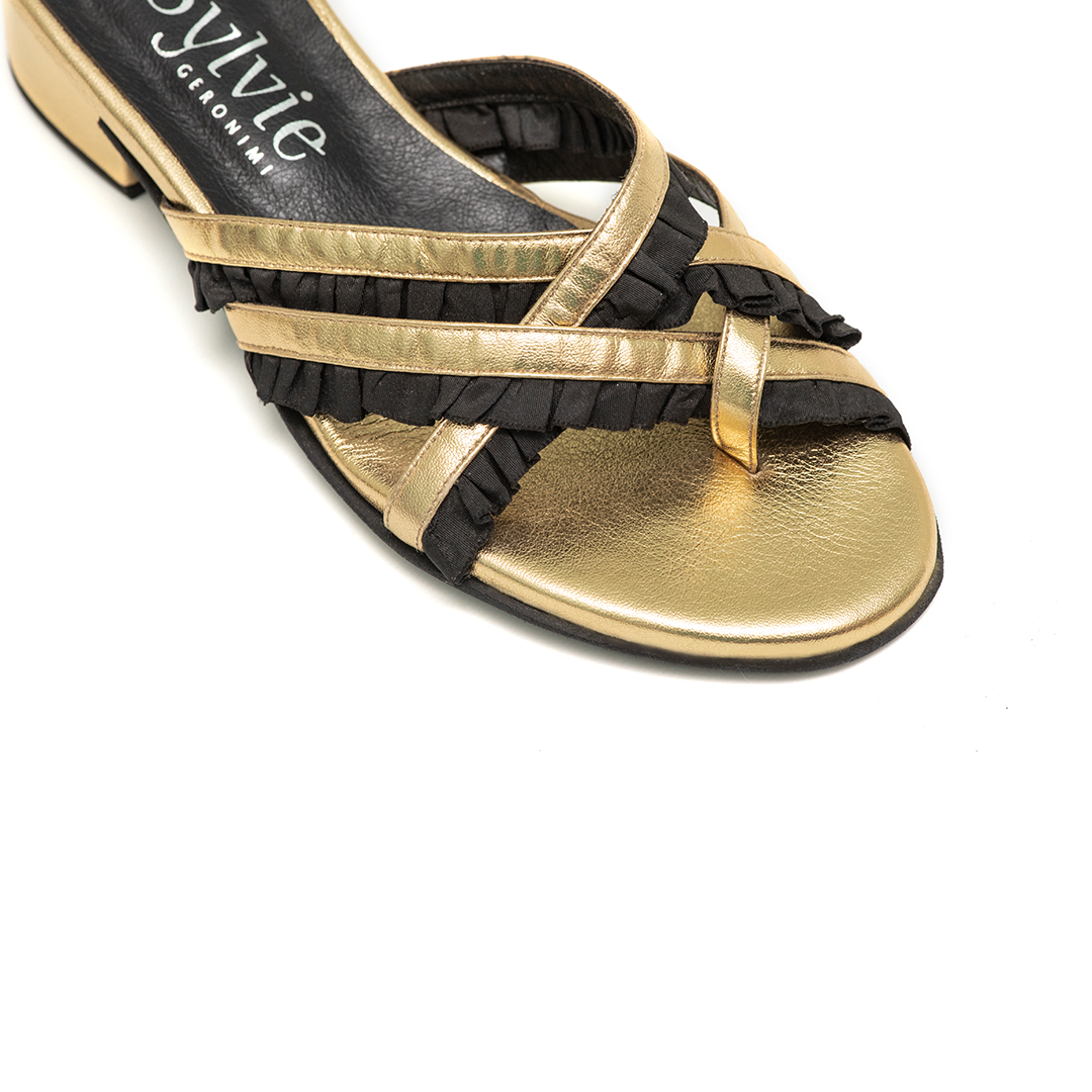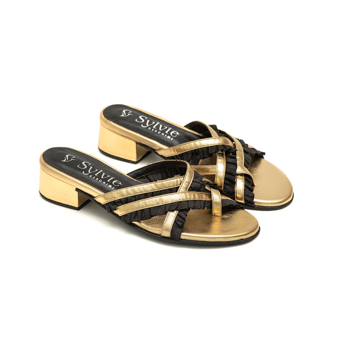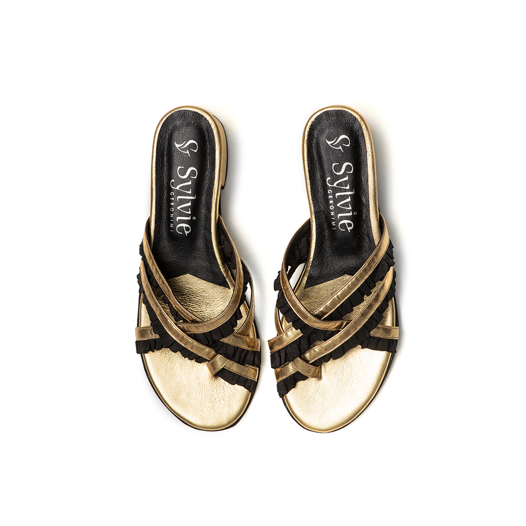 • Volados de raso negro: Detalle contrastante que acentúa cada tira con movimiento y elegancia.