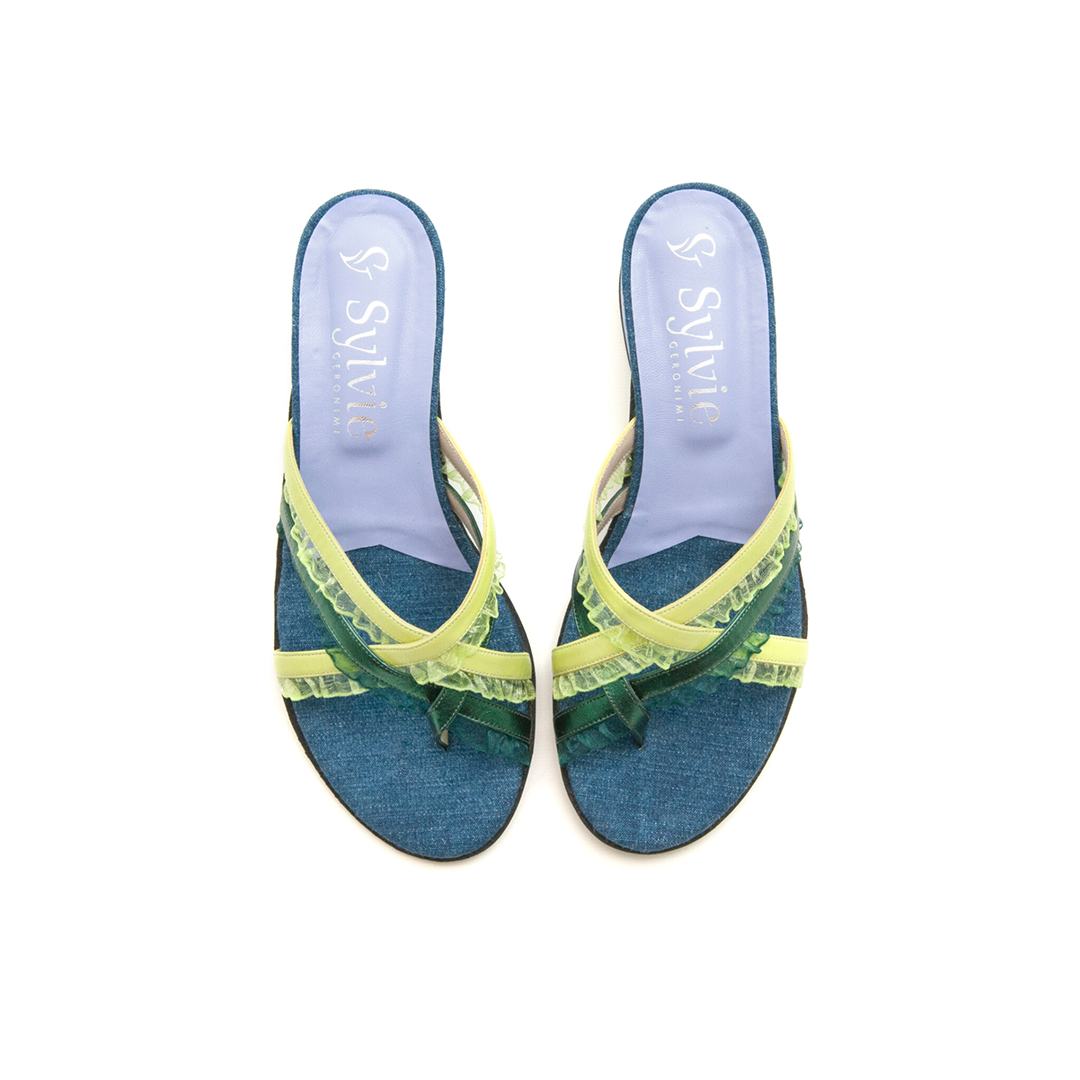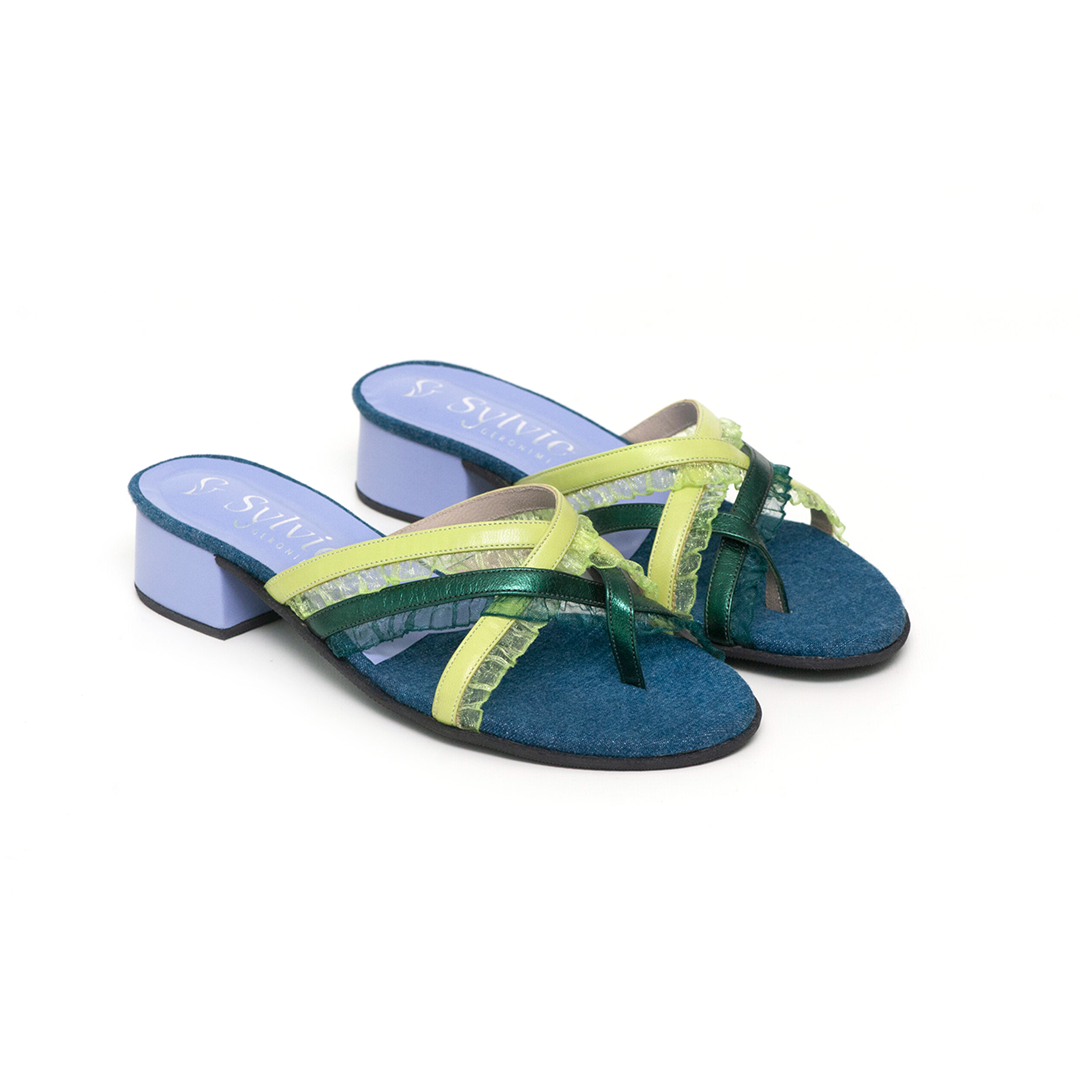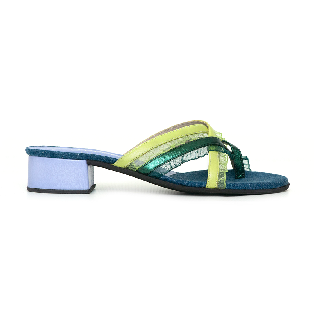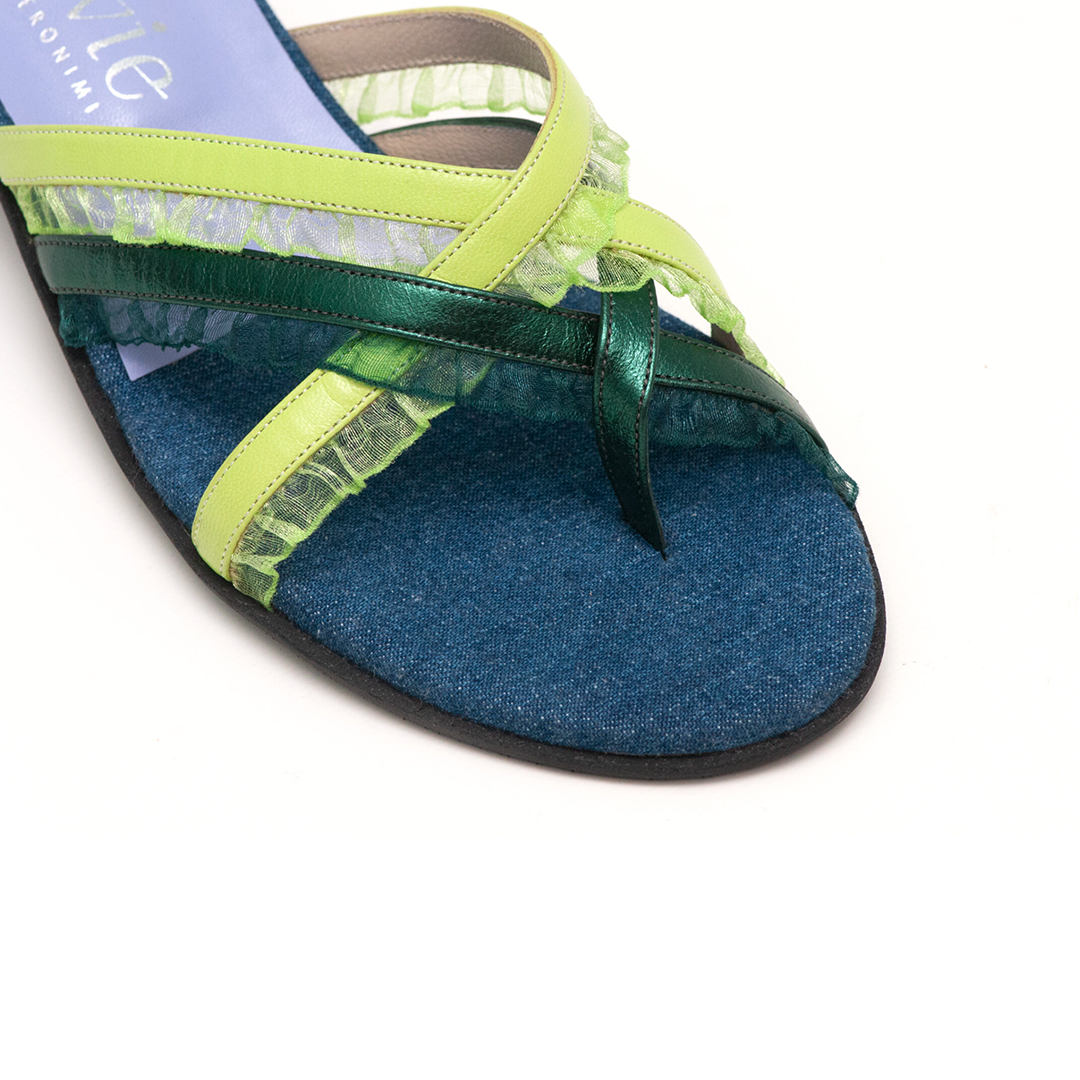 La Ojota Alexandrie combina texturas y tonos verdes en un diseño fresco y contemporáneo, ideal para quienes buscan comodidad con estilo.