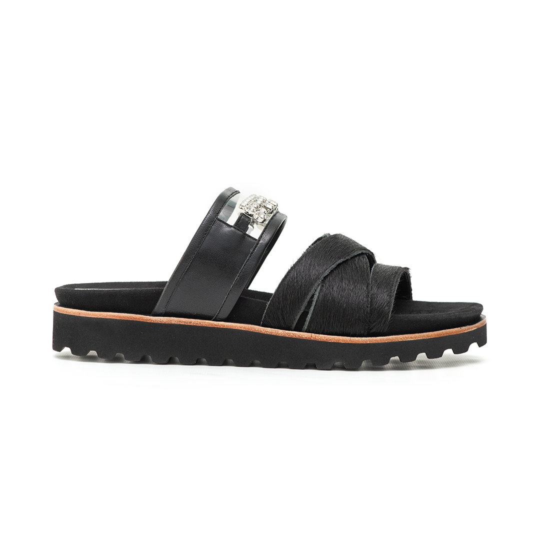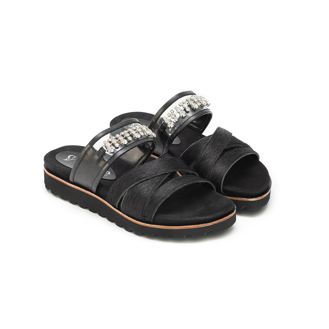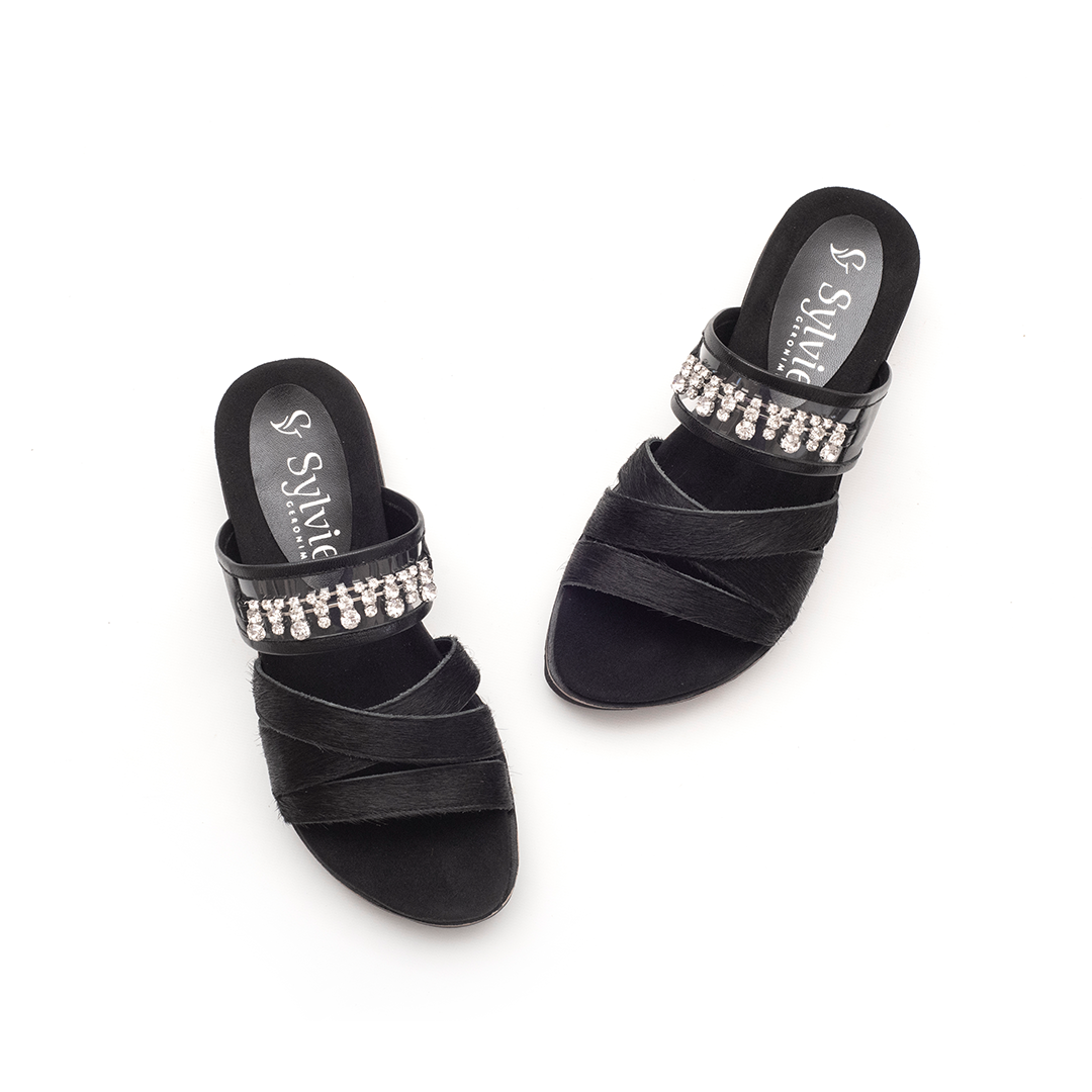 • Tira central en cabritilla negra con fondo acrílico y pulsera de strass: Un detalle luminoso que eleva la sandalia con un toque de distinción.