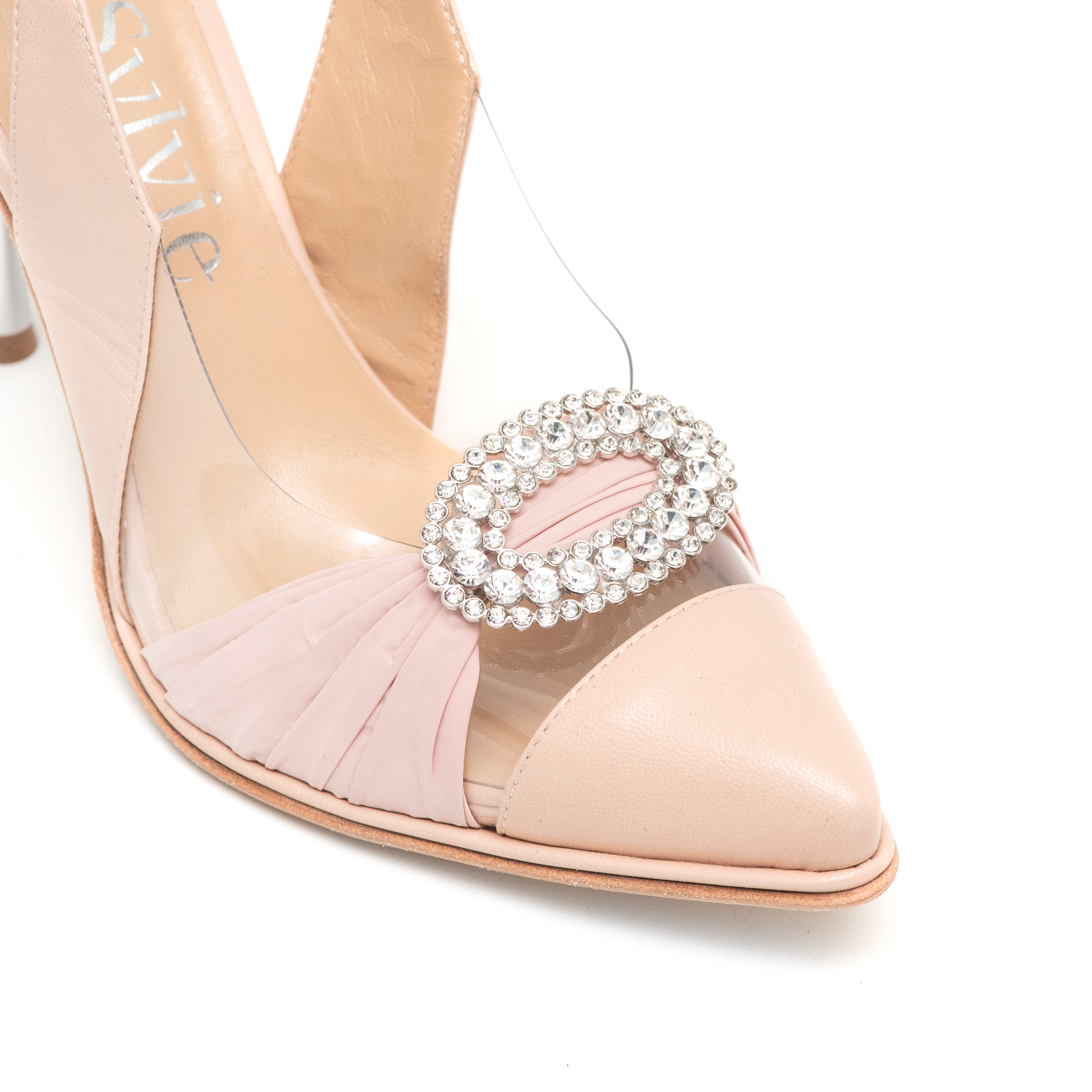• Cabritilla nude con detalles de acrílico transparente: Aporta frescura y modernidad manteniendo una base neutra y versátil.