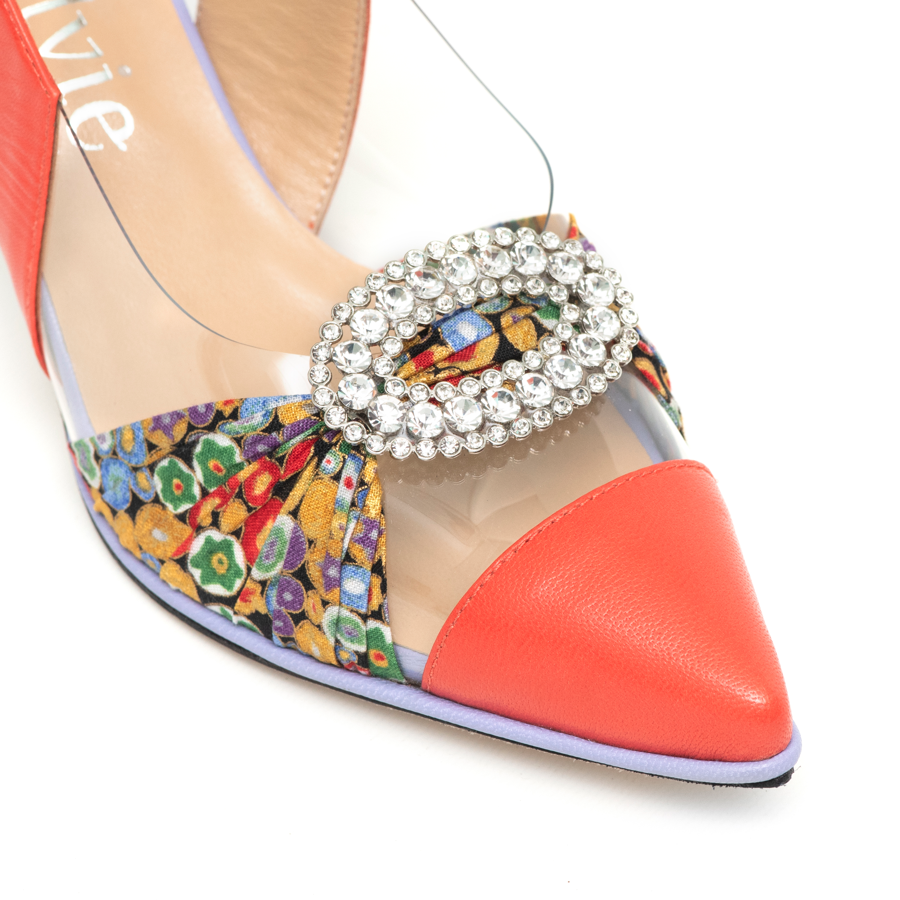 El Stiletto Klimt Orange es una versión vibrante y audaz del icónico diseño de Sylvie Geronimi, que combina materiales llamativos con detalles artísticos únicos.