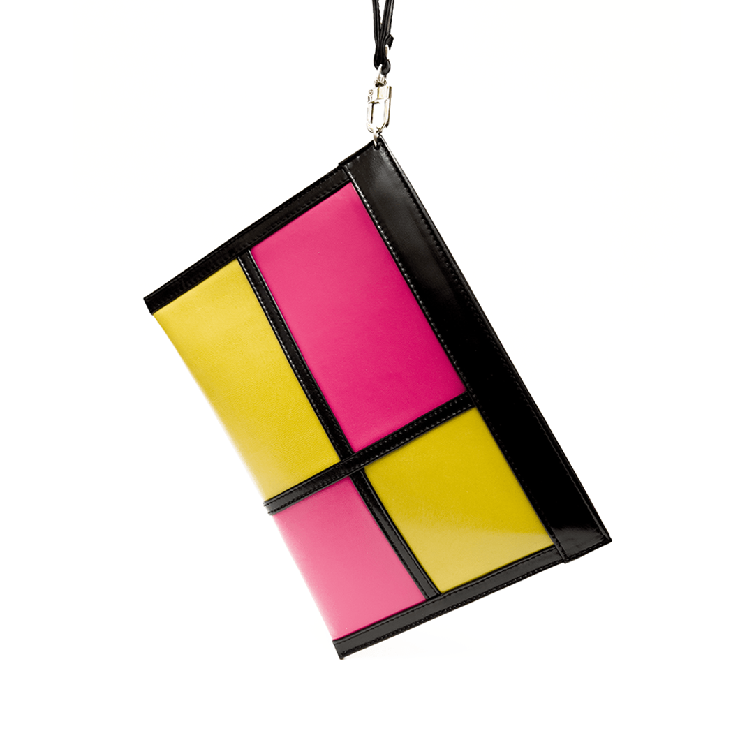 Sobre de mano de cabritilla negra, verde y fucsia | Lazo de mano de 20 cm. | Medidas: 26×17,5 cm.