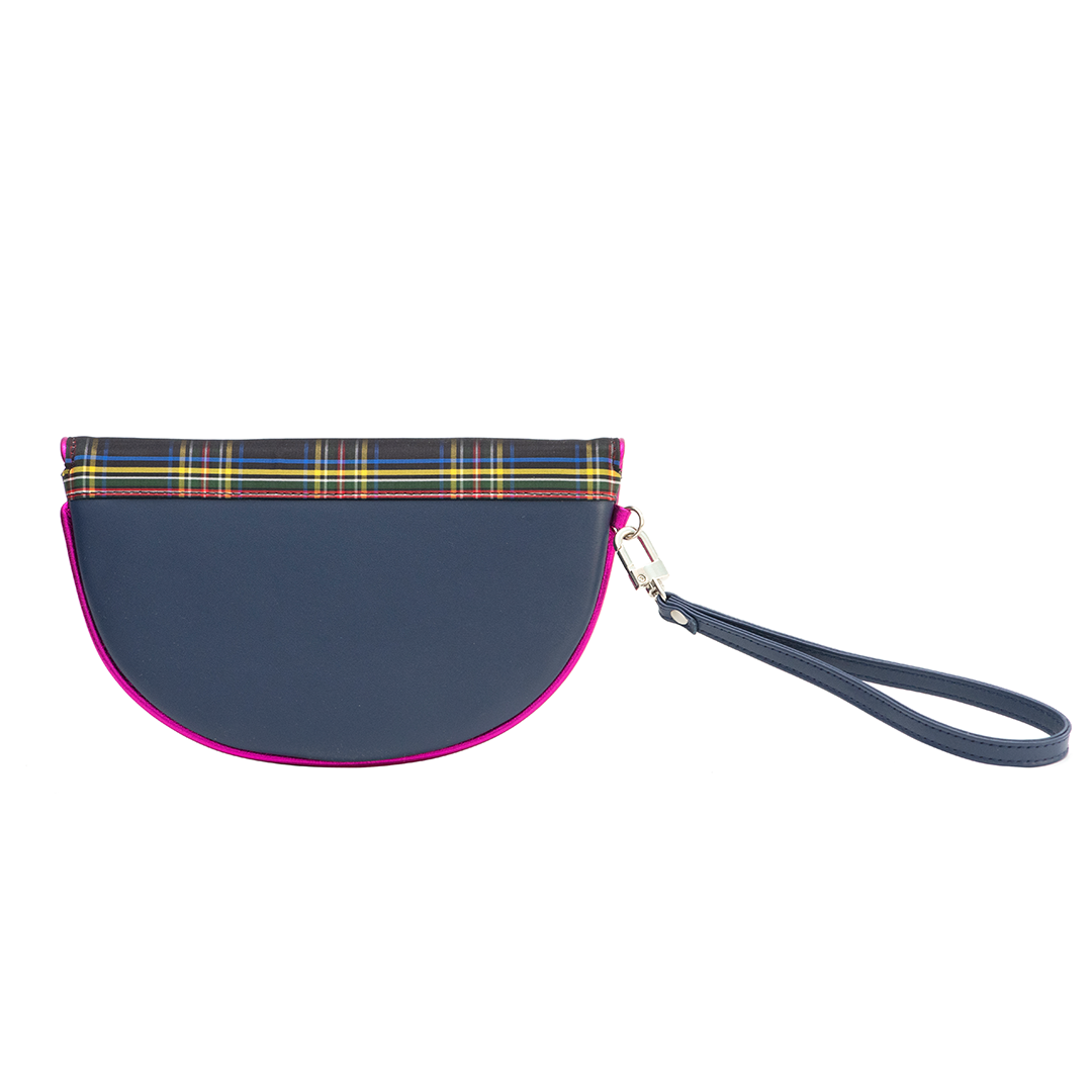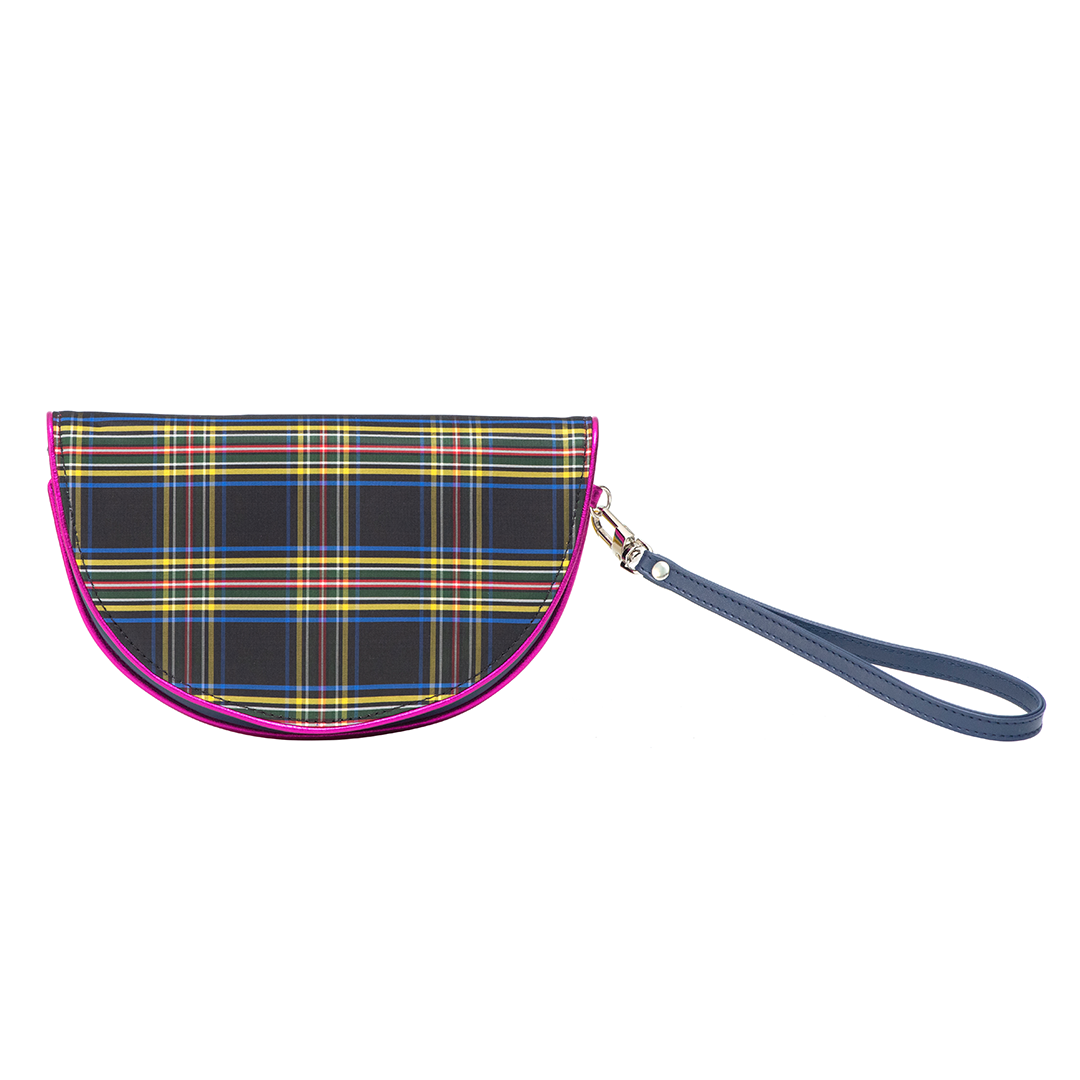 Tafeta escocesa con vivo en cuero metalizado fucsia: Una combinación llamativa que resalta por su contraste de texturas y colores vivos.